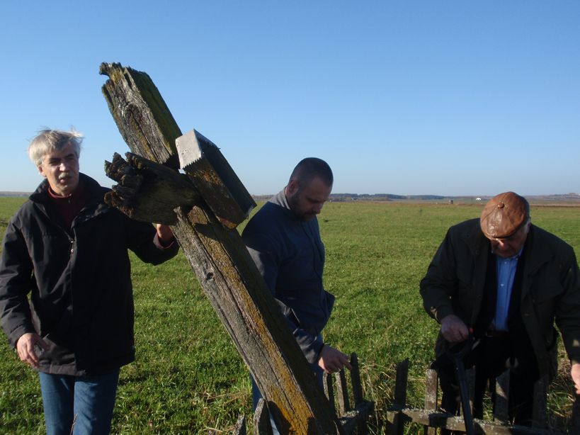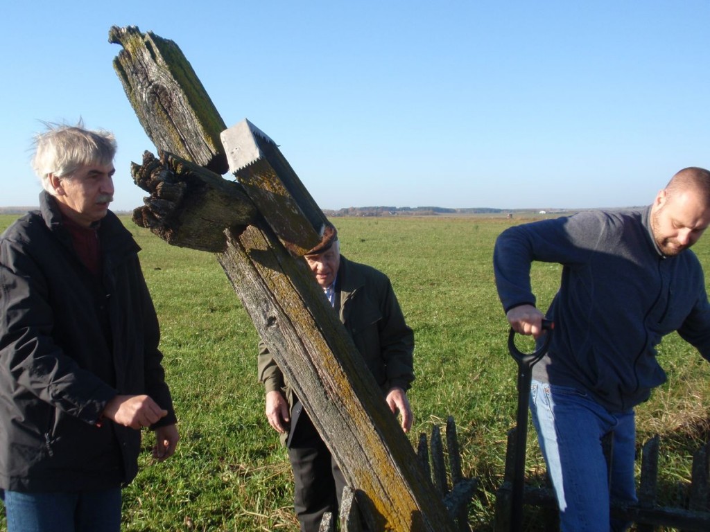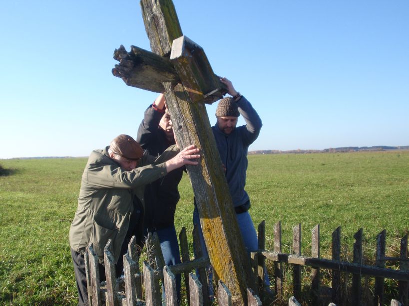 Wykopaliśmy nowy dół i – postawiony równo krzyż – wzmocniliśmy nazbieranymi na miedzach okolicznych pól dużymi kamieniami. Przyglądając się mocno już zniszczonemu krzyżowi wyrażaliśmy cichą nadzieję, że może znajdzie się w miarę szybko jakieś Muzeum lub też inna instytucja, która zabezpieczy i zakonserwuje zabytkowy już dzisiaj obiekt, a w jego miejsce postawi nowy. Niestety, oryginalny krzyż, nie ma szans na przetrwanie.